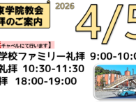 関東学院教会に連なる皆さま 2026年4月12日(日)の礼拝のご案内です。 教会学校・主日礼拝は大学チャペルで、夕礼拝は追浜チャペルで行います。 教会学校ファミ…