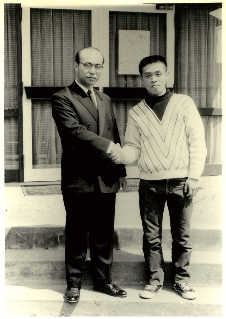 【写真:1971年4月 イースター礼拝 上↑ バプテスマ後に加納牧師(左)と。