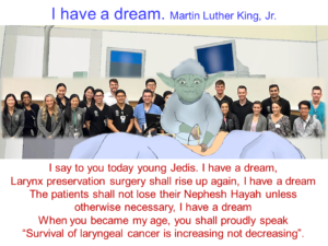 私の講義では最後をマーチン・ルーサー・キング牧師の有名な”I HAVE A DREAM”、になぞらえて語りかけました。「若人よ、私には夢がある。声を残す手術が今以上に用いられることを。私には夢がある。患者がネフイシュ・喉・生ける魂を極限まで失わないことを。私には夢がある。大きな願望を持ち、あなたたちが私の年齢になった時、喉頭癌の生存率が上昇に転じた、と誇りを持って言えるように」。