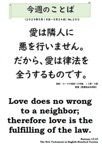 愛は隣人に悪を行いません。だから、愛は律法を全うするものです。