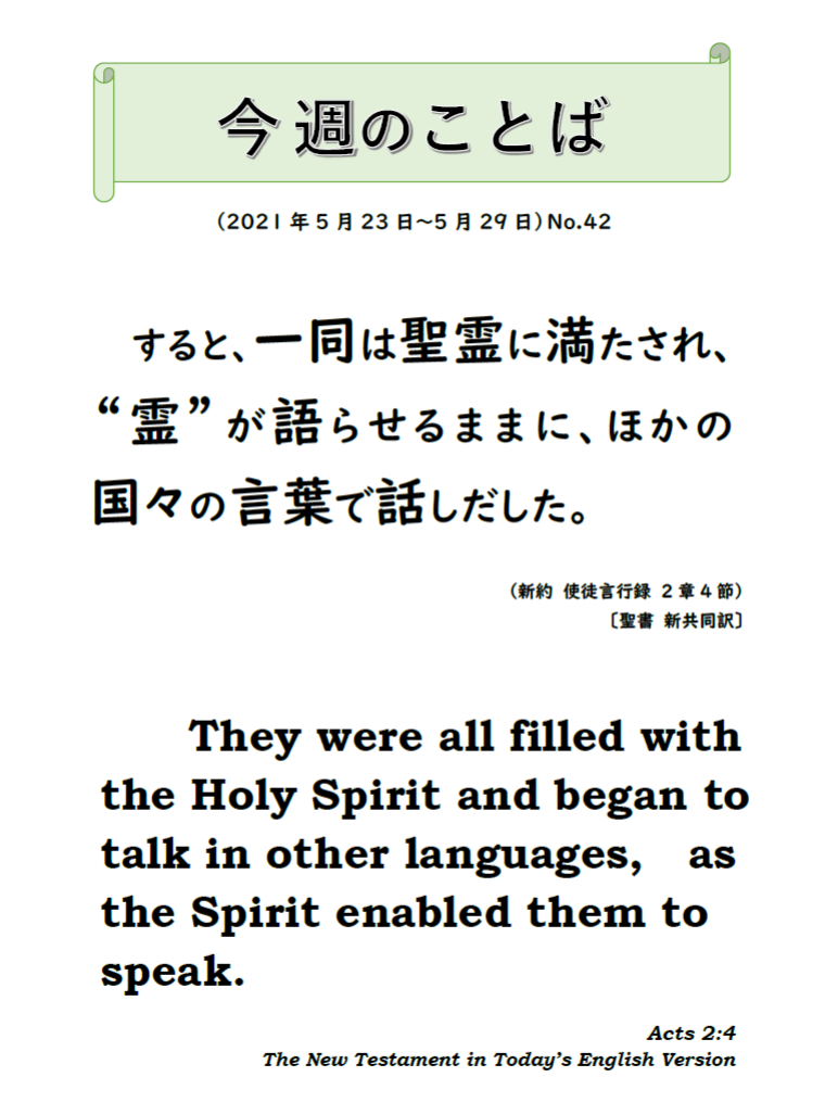 すると、一同は聖霊に満たされ、“霊”が語らせるままに、ほかの国々の言葉で話しだした。 (新約 使徒言行録 2章4節)〔聖書 新共同訳〕 They …