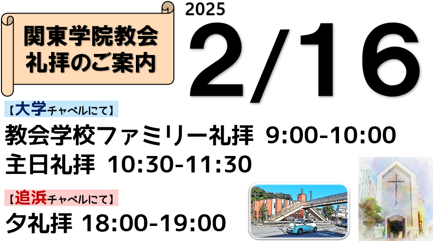 2月16日 関東学院教会 礼拝のご案内です。 ⛪教会学校ファミリー礼拝と、主日礼拝を大学チャペルで行います。 💒夕礼拝を追浜チャペルで行います。 あなたのご来会…