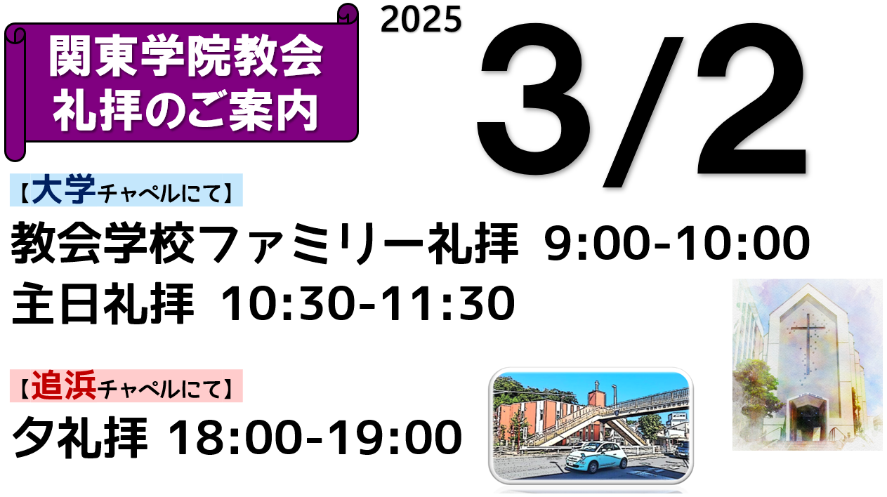 3月2日 関東学院教会 礼拝のご案内です。 ⛪教会学校ファミリー礼拝と主日礼拝を大学チャペルで行います。 💒夕礼拝を追浜チャペルで行います。 あなたのご来会、礼…