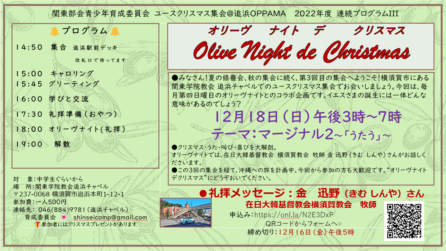 12月18日(日) 15:00~19:00 追浜チャペルにて ユース交流・学び合いのプログラム 「オリーヴナイト デ クリスマス」 を行います。 ◆◇◆ 15:…