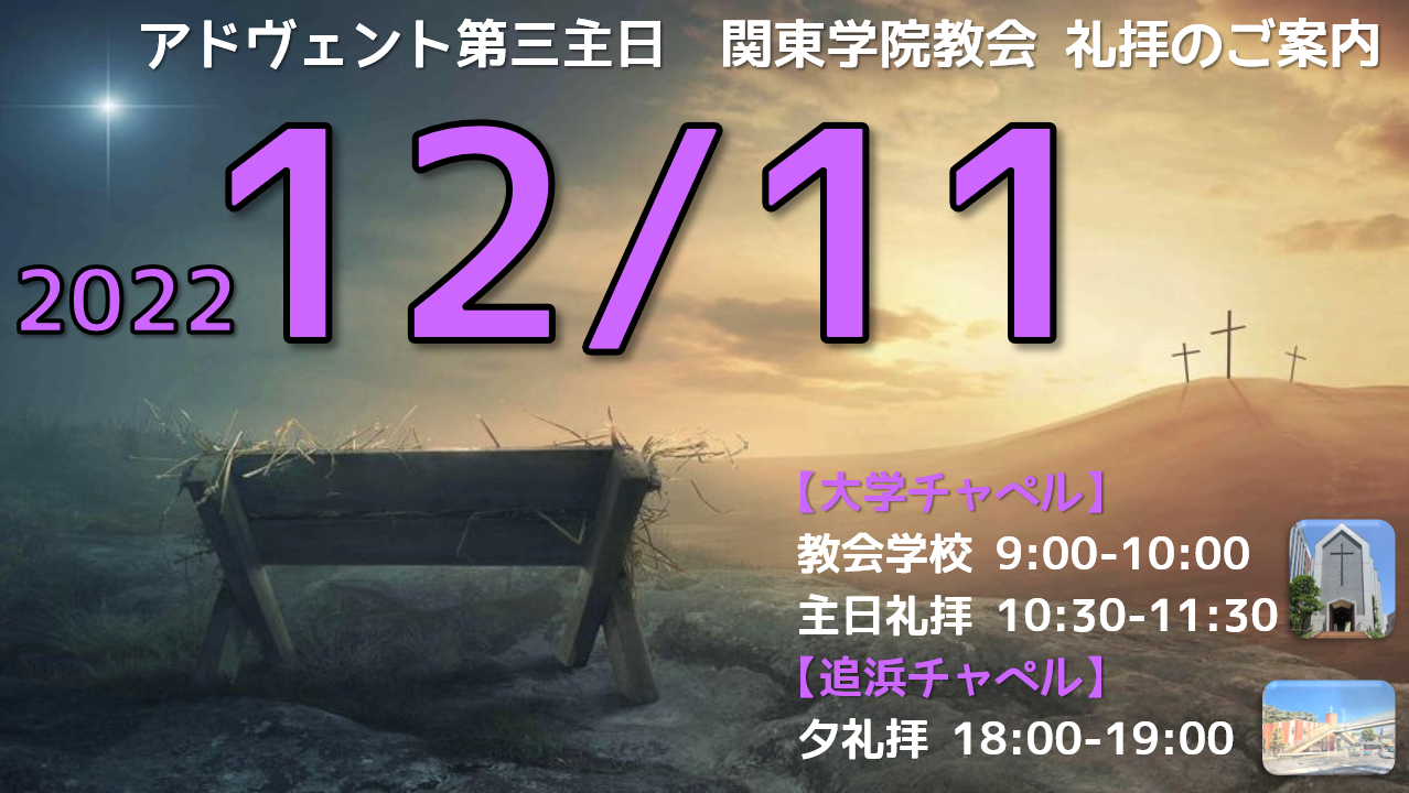 2022年12月11日(日)関東学院教会 教会学校礼拝、主日礼拝、夕礼拝のご案内、YouTube配信リンク、説教要約