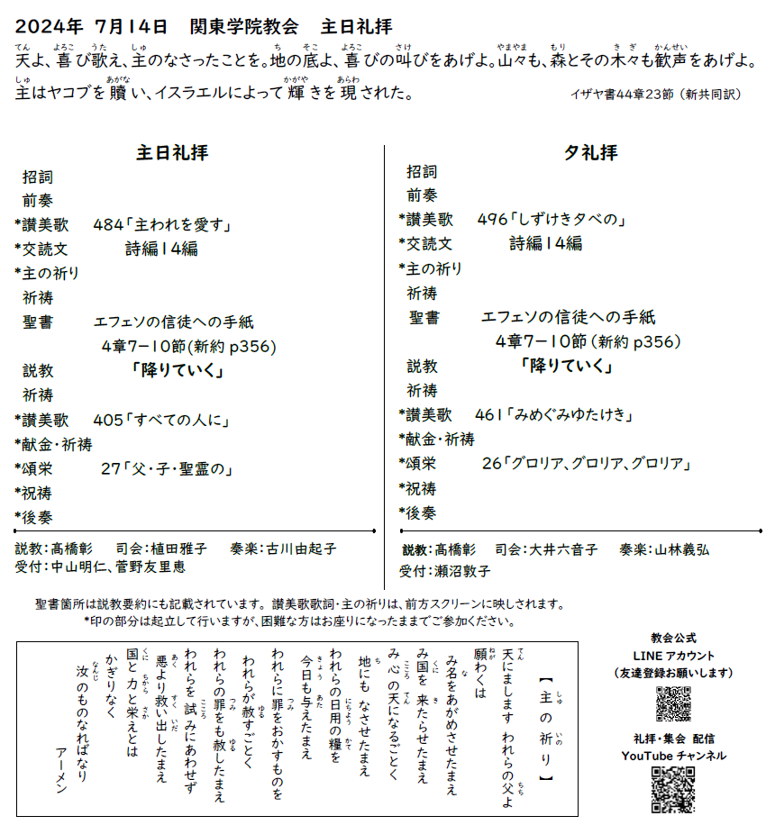 2024年7月14日(日)関東学院教会 教会学校ファミリー礼拝、主日礼拝、夕礼拝のご案内、YouTube配信リンク、説教要約