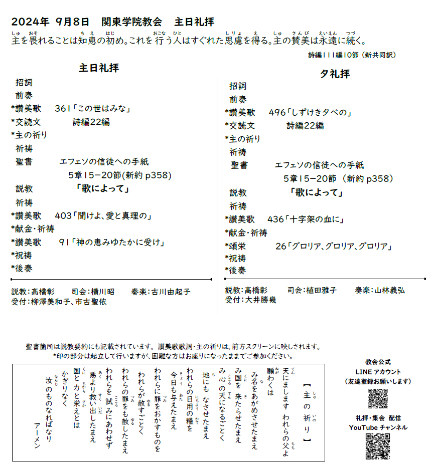 2024年9月8日(日)関東学院教会 教会学校ファミリー礼拝、主日礼拝、夕礼拝のご案内、YouTube配信リンク、説教要約