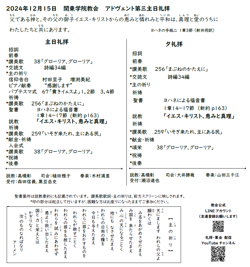 2024年12月15日(日)関東学院教会 教会学校ファミリー礼拝、主日礼拝、夕礼拝のご案内、YouTube配信リンク、説教要約