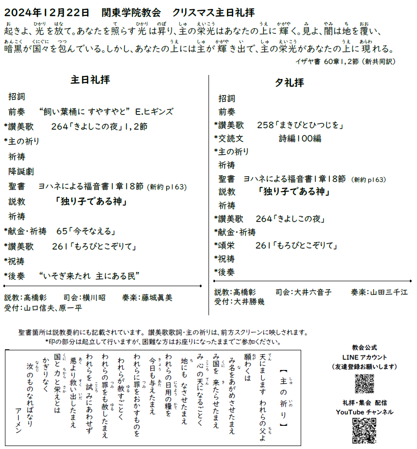 2024年12月22日(日)関東学院教会 クリスマス主日礼拝、夕礼拝のご案内、YouTube配信リンク、説教要約