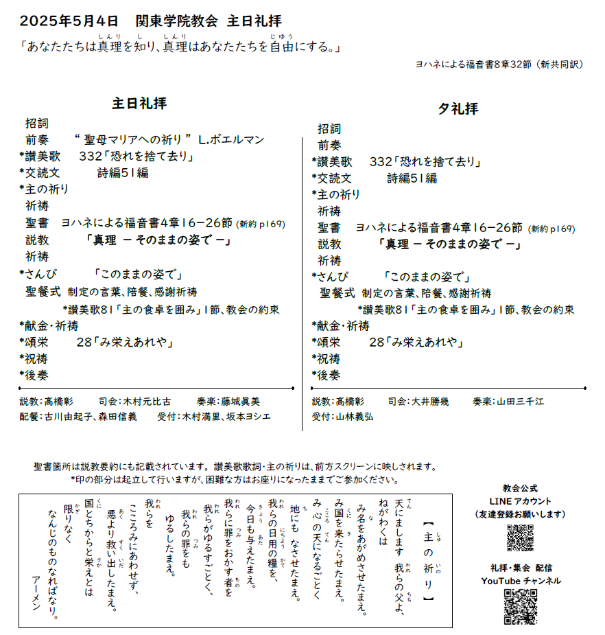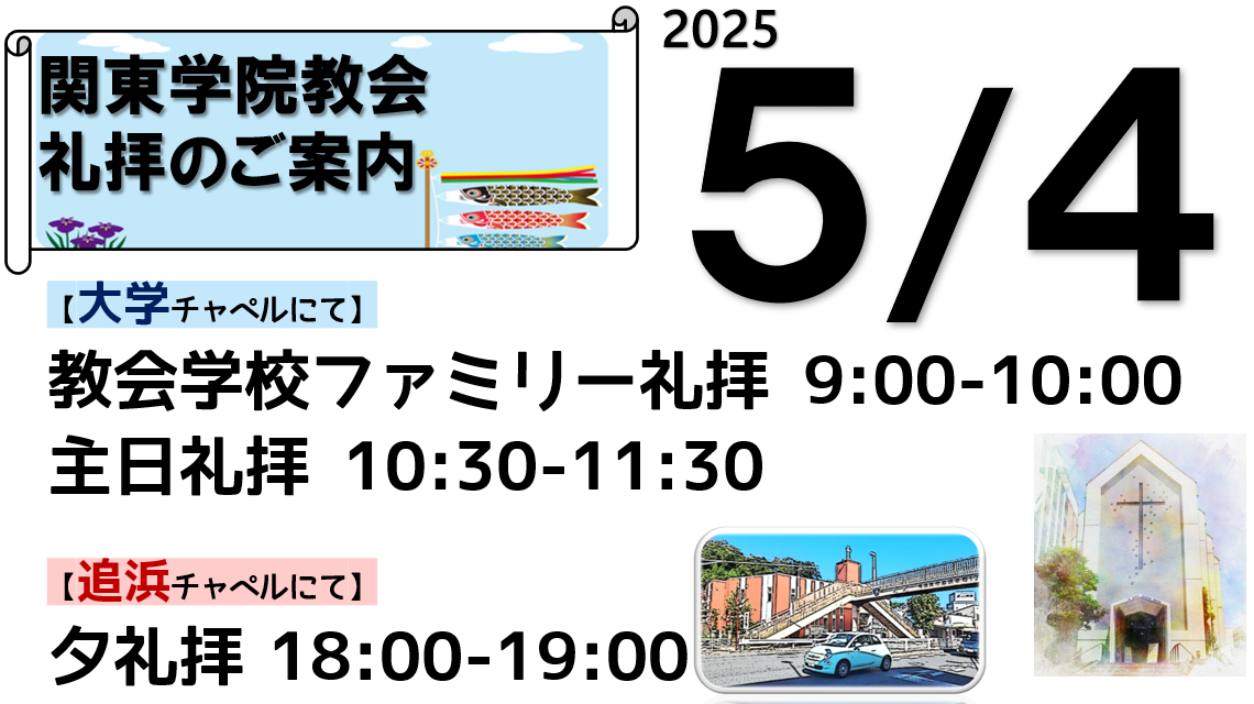 2025年5月4日(日)関東学院教会 教会学校ファミリー礼拝、主日礼拝、夕礼拝 のご案内、YouTube配信リンク、説教要約