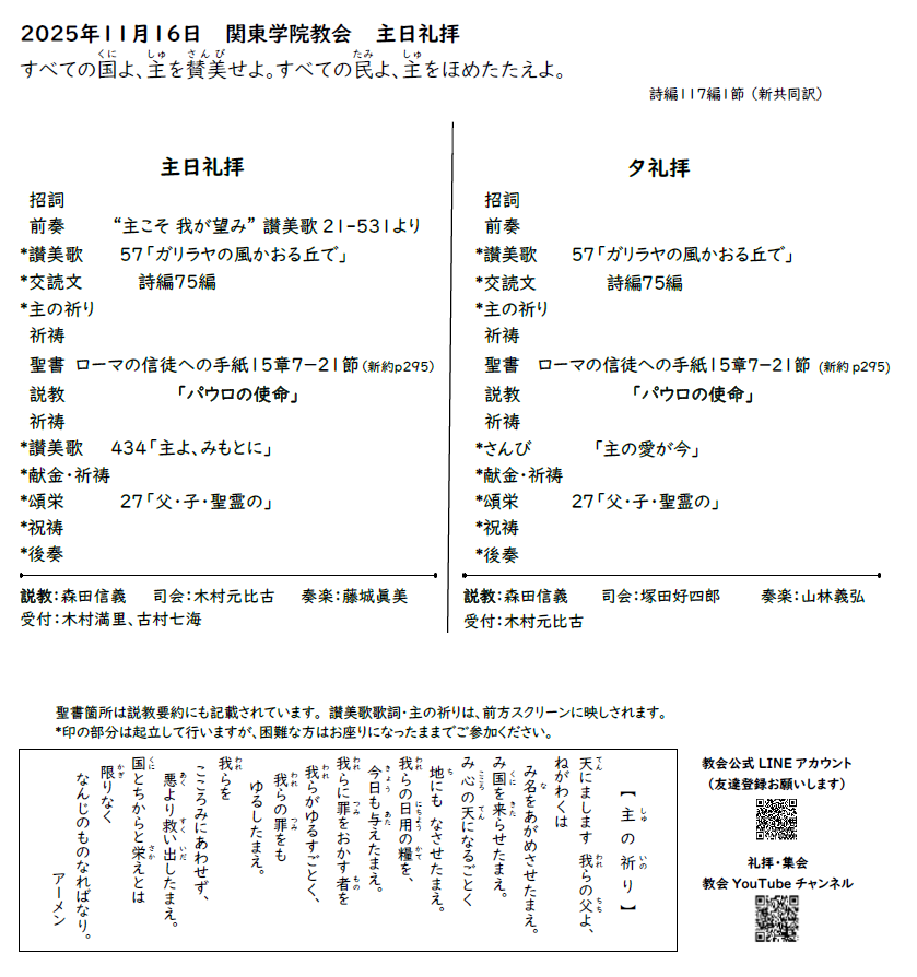 2025年11月16日(日)関東学院教会 礼拝のご案内、YouTube配信リンク、説教要約