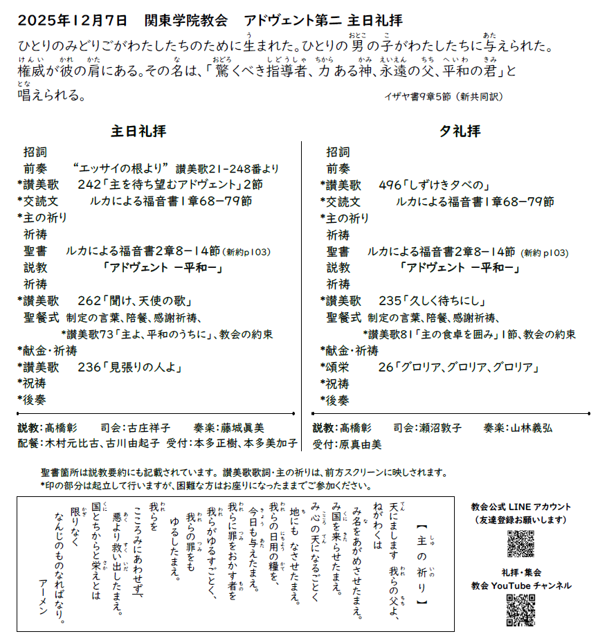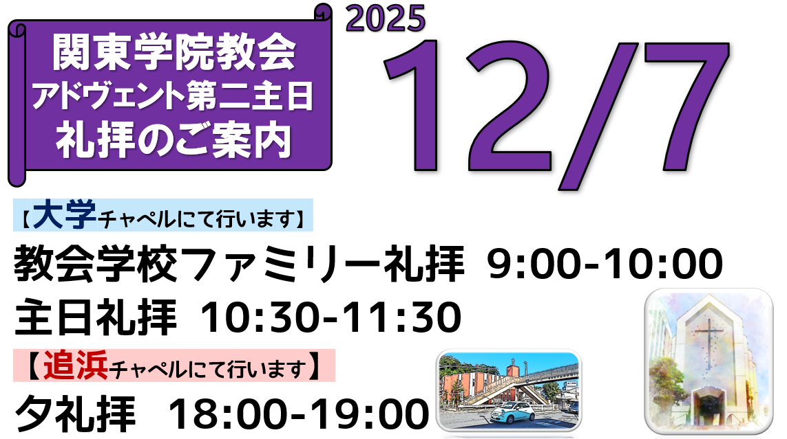 2025年12月7日(日)関東学院教会 アドヴェント第二主日 礼拝のご案内、YouTube配信リンク、説教要約