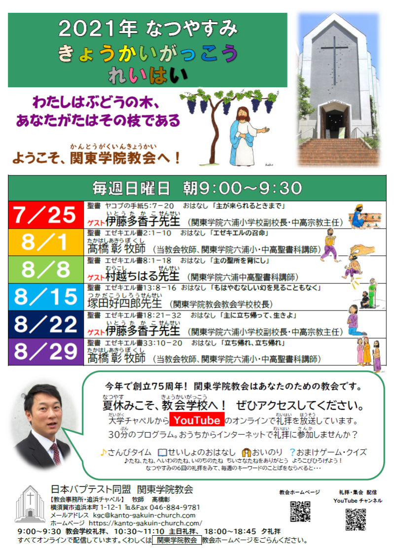 神奈川県下に非常事態宣言が発令されました。大学礼拝堂も使用制限を行うため、8/8(日)から当面の期間、関東学院教会の日曜日の教会学校礼拝、主日礼拝は、追浜チャペルで行うことになりました。配信は変わらず同じ時間に行います。